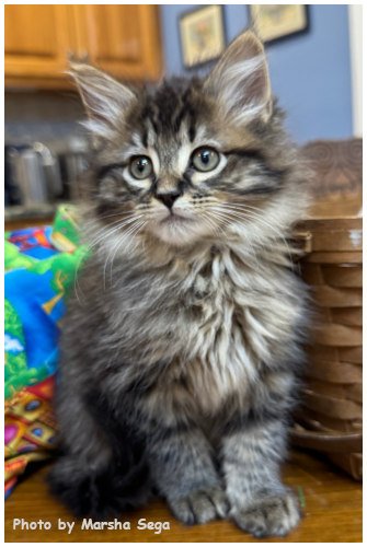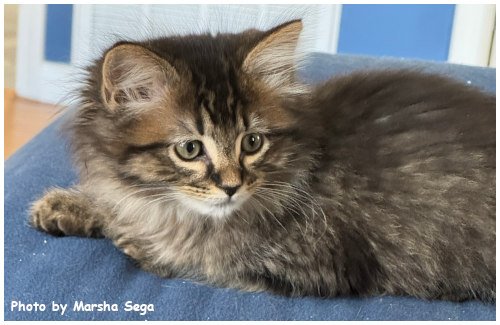 DUSTY is a playful and trusting Maine coon mix kitten. She is set for automatic purr when she is picked up. She will let you carry her around in the baby doll cuddle pose for as long as she can stand it. We believe she may also have some Ragdoll genes, as she trusts humans to hold on to her, so she doesn’t fall.