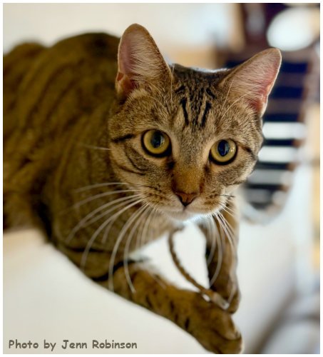 Hi, I’m Munchkin. I used to be called Velvet, but I got this name because I’m just a little guy. Even though I’m a year-old brown tabby, I am only about 11 pounds. However, I do have a big personality, and I love to leap high into the air to catch a string toy. Boy, that’s my favorite activity. My foster mom has taken lots of videos of me chasing those toys. Most of the time my foster mom can find me sitting by one and begging with my eyes for her to "make it move”! The treat game is another of my favorite activities. See, we have a puzzle that my foster family uses and she puts treats in them. Then I have to figure out how to get them out. I do love treats. OOOH and that push-pop-licky thing - I think she calls it a Churu… wow those are awesome! Like, I’ll do anything for one of those. I am a bit nervous around strangers, and dogs really scare me. I’d love a forever family that is older and quiet. I don’t remember what happened to me or how I ended up in the shelter (I was really young), but, it must have been a little traumatic- all I remember is my foster mom picking me out of all the others. She said she saw something special in me. I’ve been with her for about 9 months, and I’d really love to find a forever family. I think I could be a wonderful emotional support animal. I will make a strong bond to one person and they will be my forever person. I will head butt them and rub on their legs while they are cooking dinner. I love to cuddle up while you watch TV and I’m a good nighttime cuddle buddy. Maybe you are looking for me, just as I am looking for you?